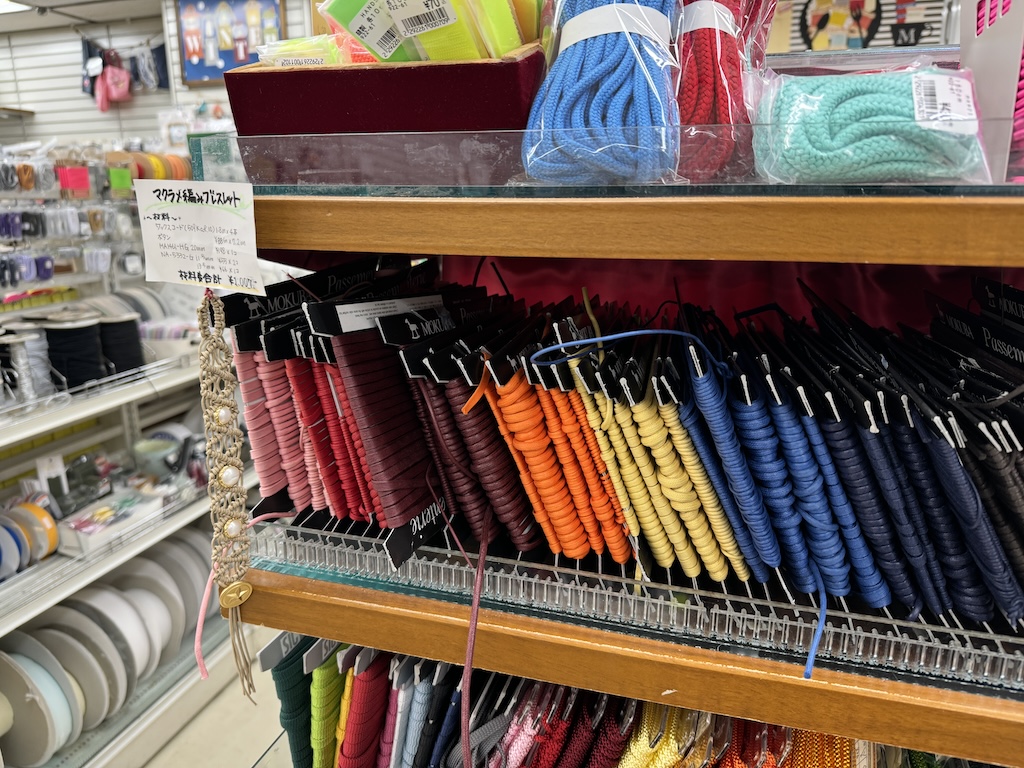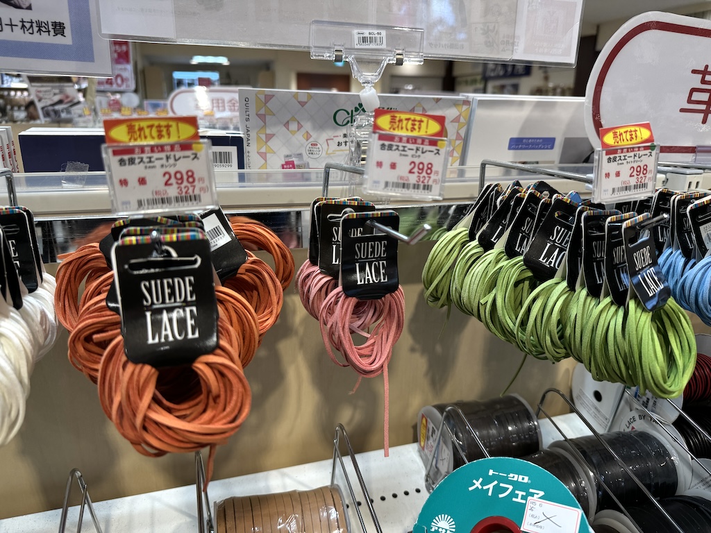 手芸屋さんやアウトドア用品店等では、様々な紐が売られています。パラコードだけで無く、革紐や綿の紐、etc…実際に手に取ってみると、あれもこれも欲しくなってつい散財しがちなのでどうぞ気をつけてください。