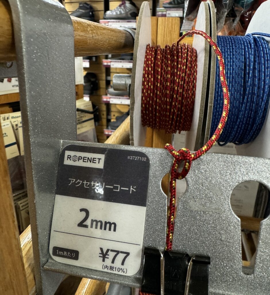 一般的には丈夫で使いやすいので、「パラコード」と呼ばれるアウトドアロープが良く使われます。1000円前後でいくつかの色を束でまとめて売っているのは、色も安っぽいのが多かったり、当たり外れが大きいのでちょっとオススメしないです。