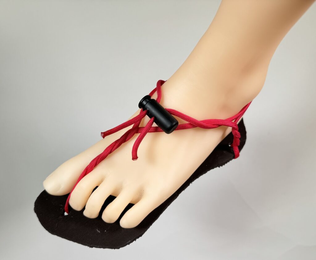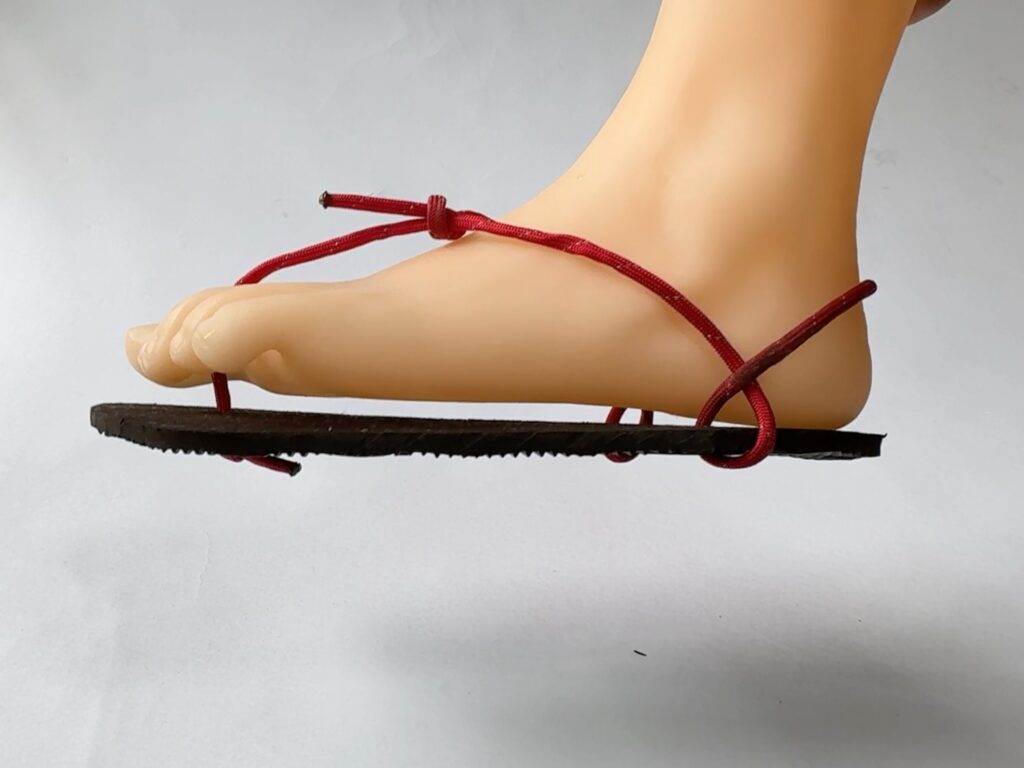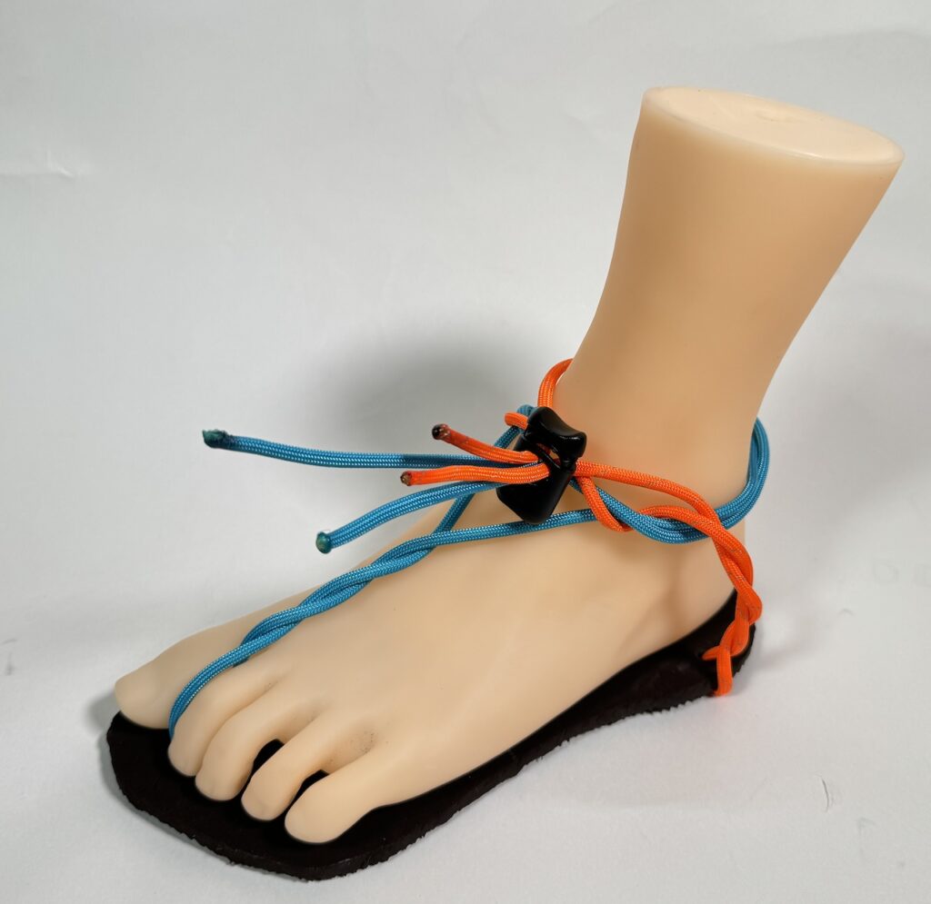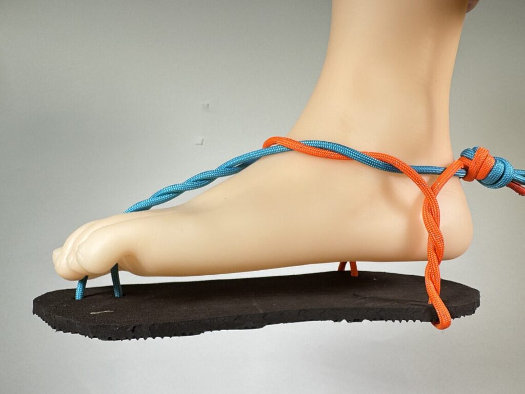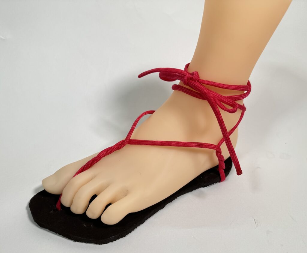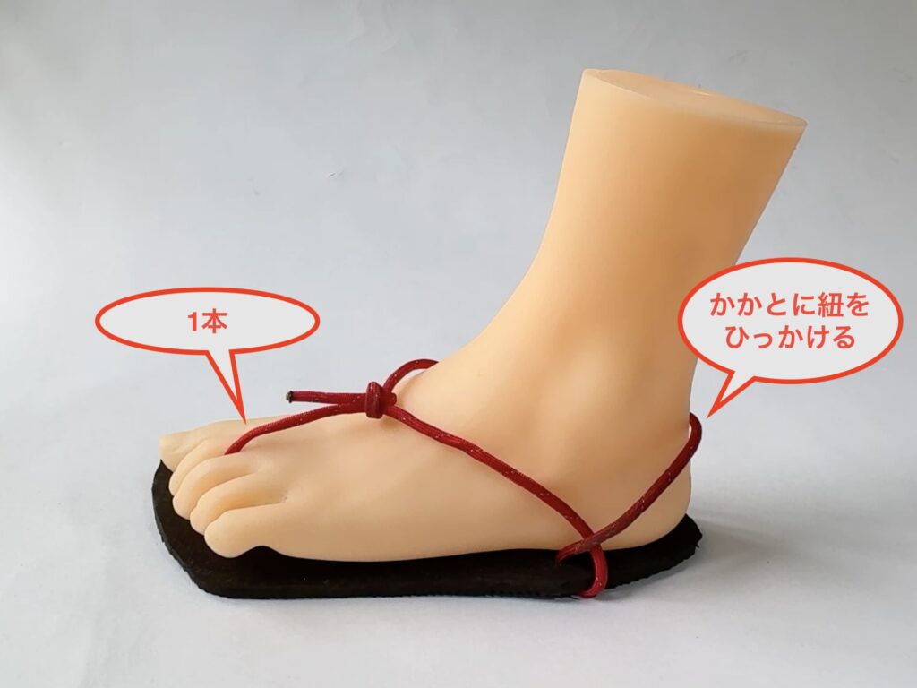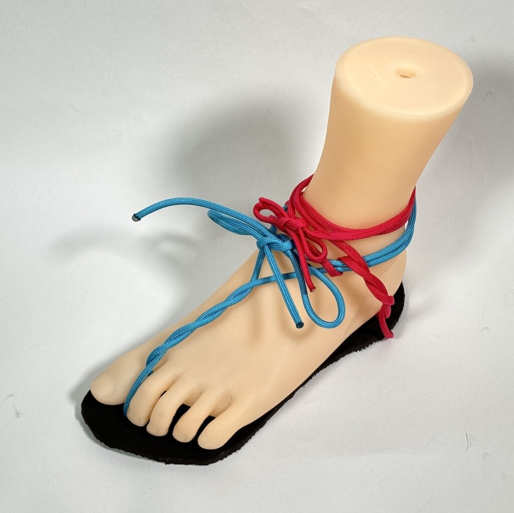 といった理由から、2本の紐でソールを足裏に保持する形式を採用しました。