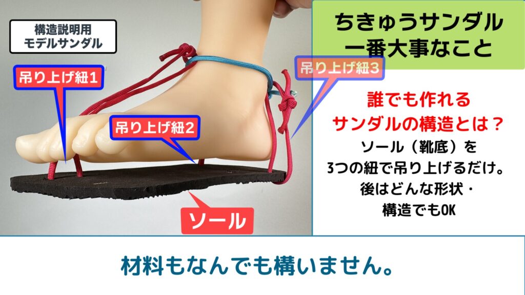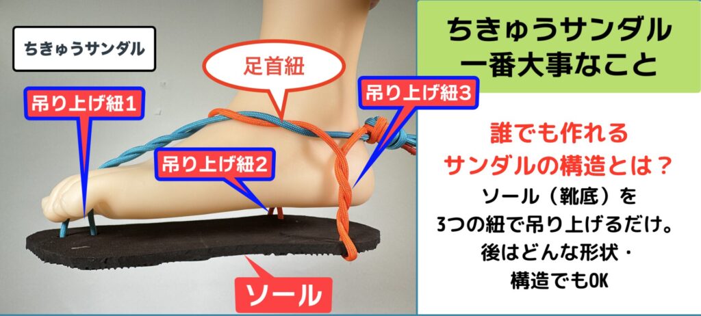 基本な構造として、ワラーチ(薄底サンダル)は、足から伸ばした3箇所の紐でソール(サンダル底)を吊り上げる形になります(三点支持)。