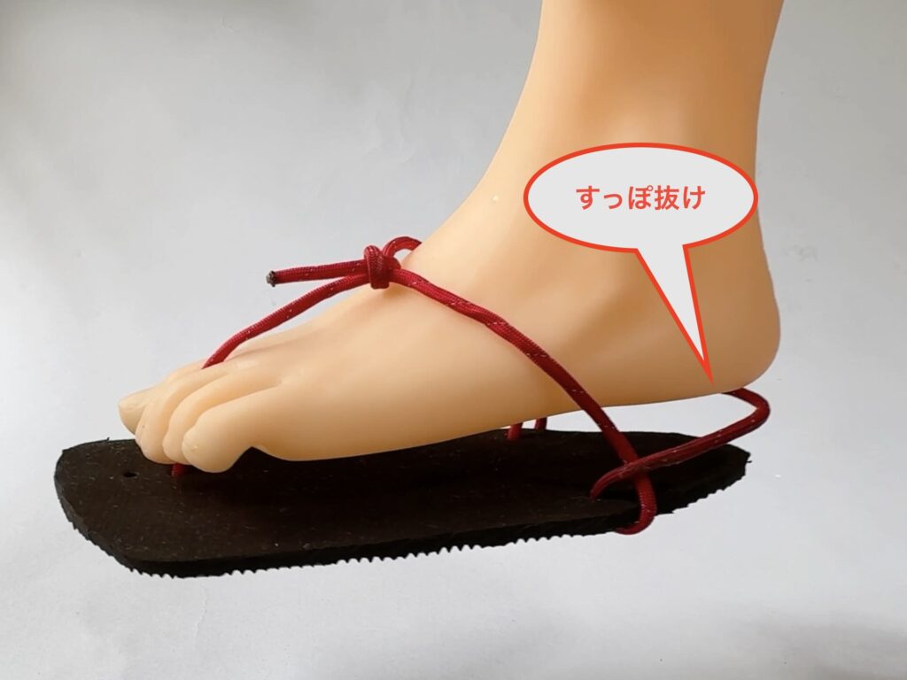 また、構造上、かかと側の紐がすっぽ抜け易いこともあります。このすっぽ抜けを防ぐ工夫として、紐自体を足にきつく締めたり、または、かかと部分の紐を二重にしたり特別な結び方をして、かかと部分の紐が自立するような工夫をして、すっぽ抜けを防ぐ物もあります。いずれにせよ、構造・作り方が複雑になりがちに思えます。