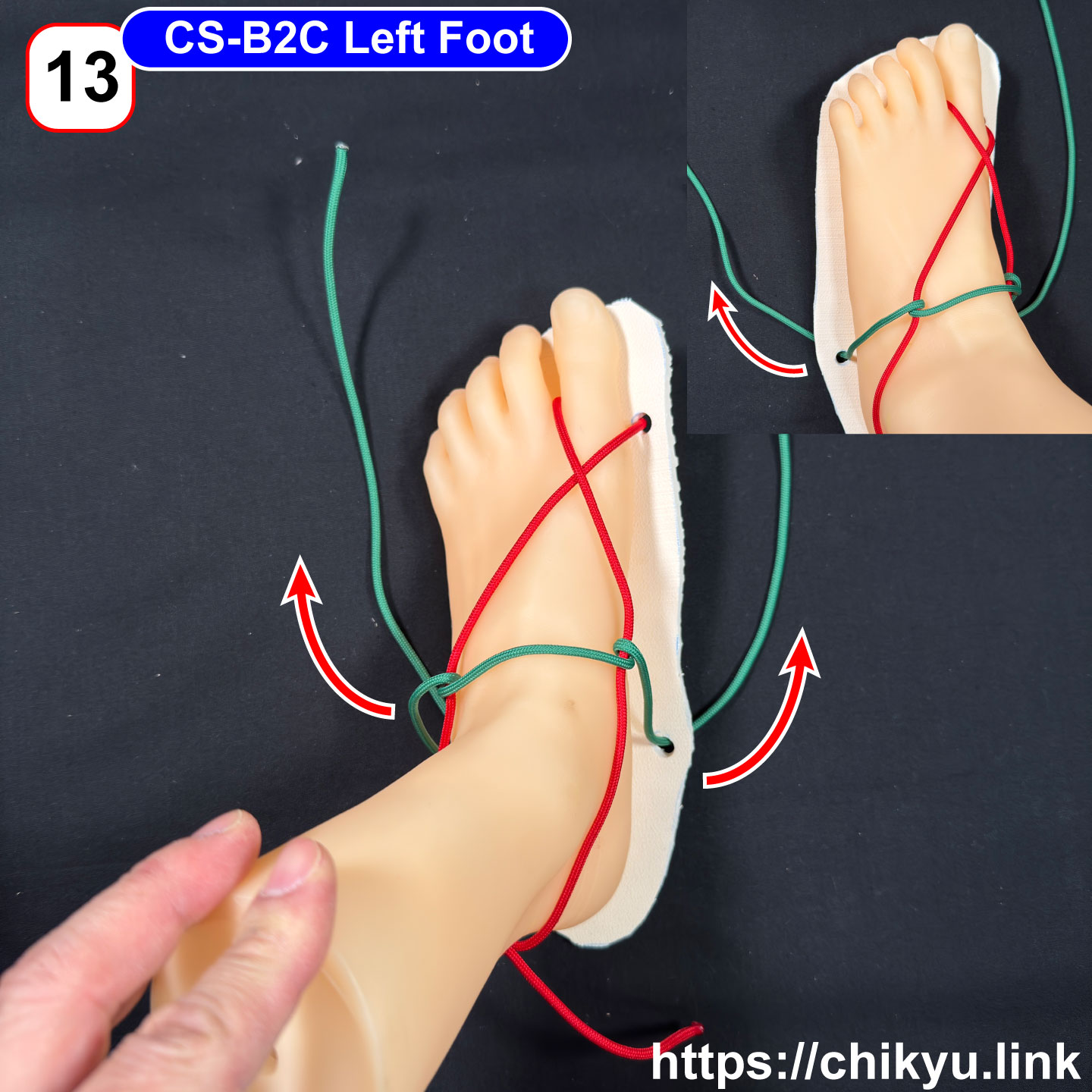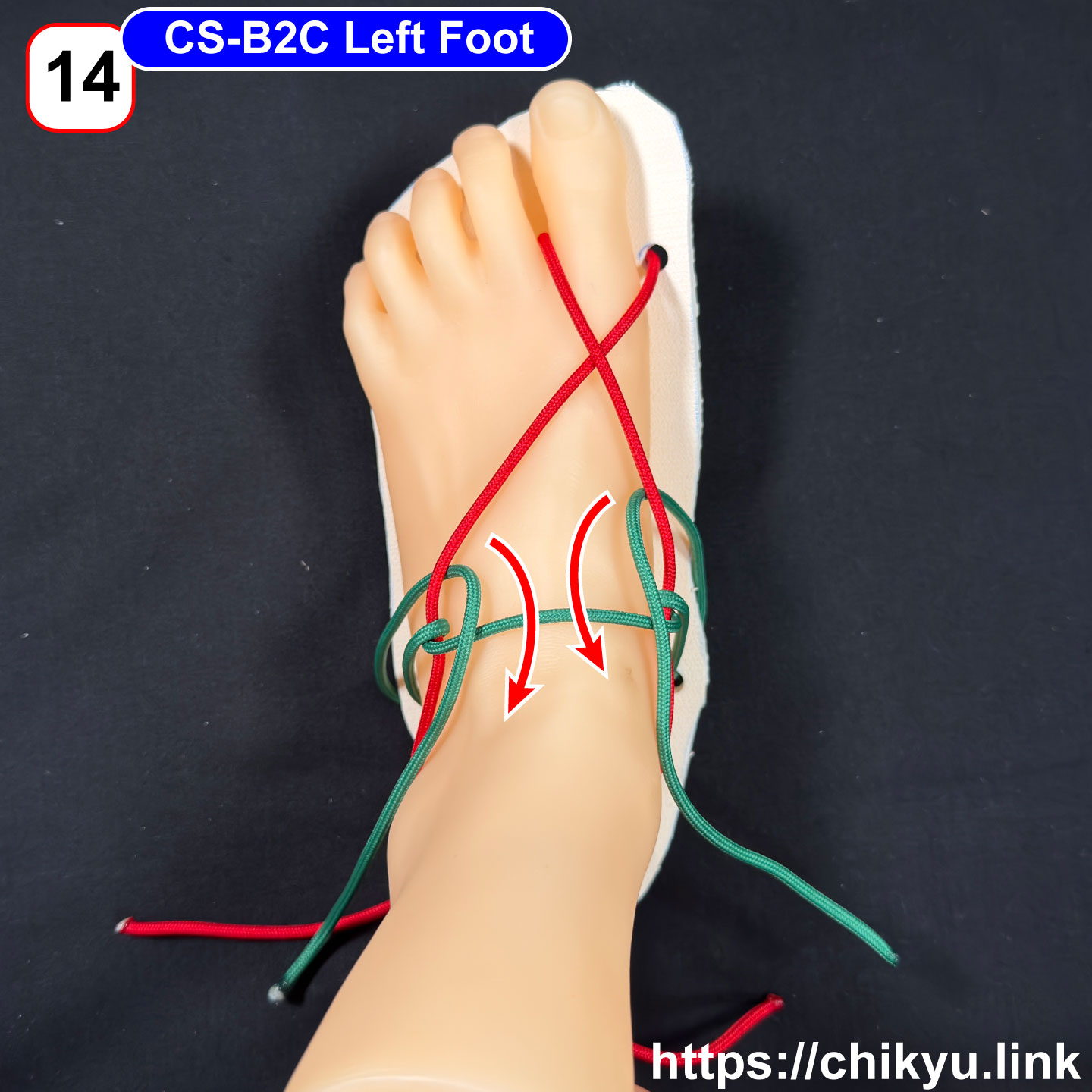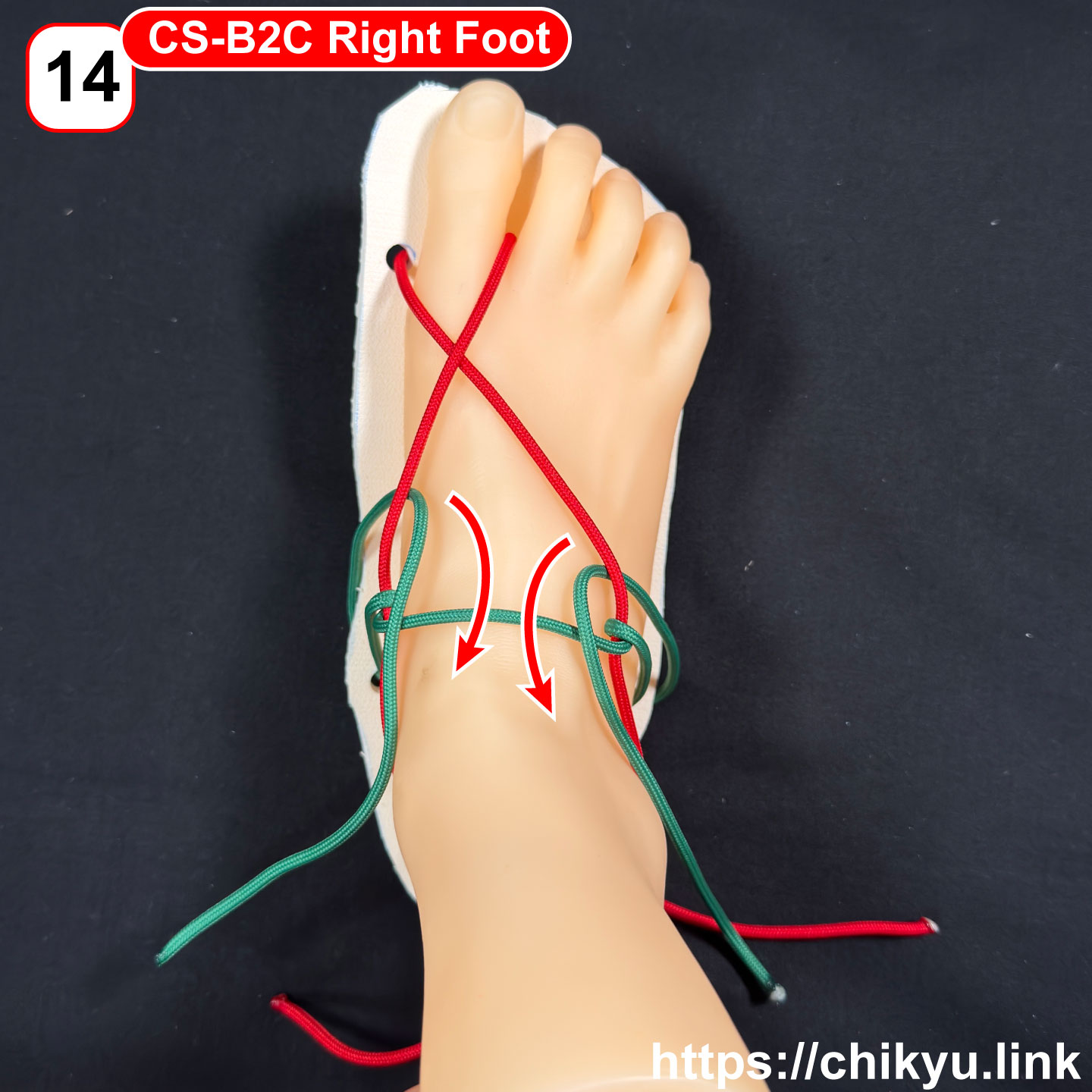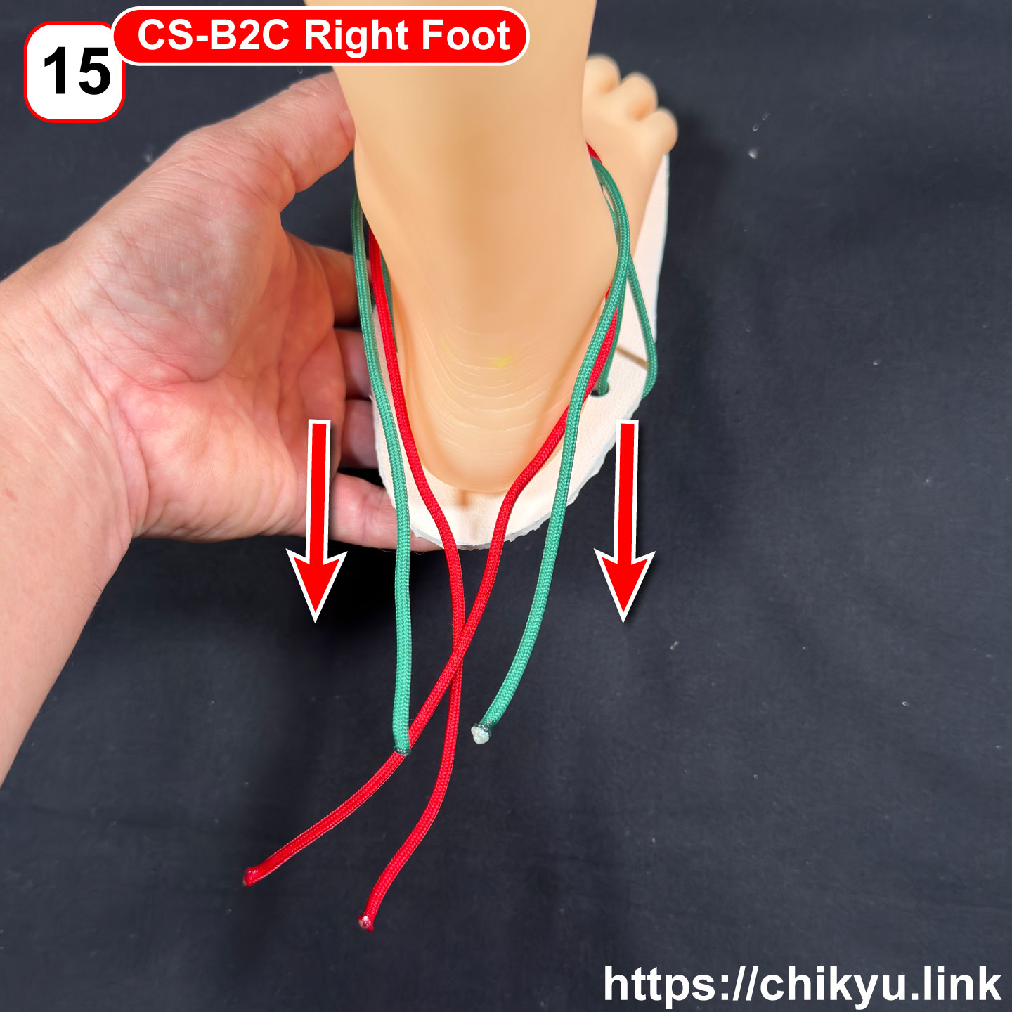 写真のように、後ろ紐(緑)を、前紐(赤)の下に通し、足の踵の方にに持って行きます。