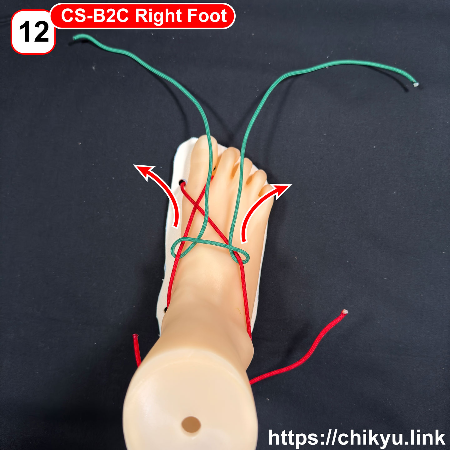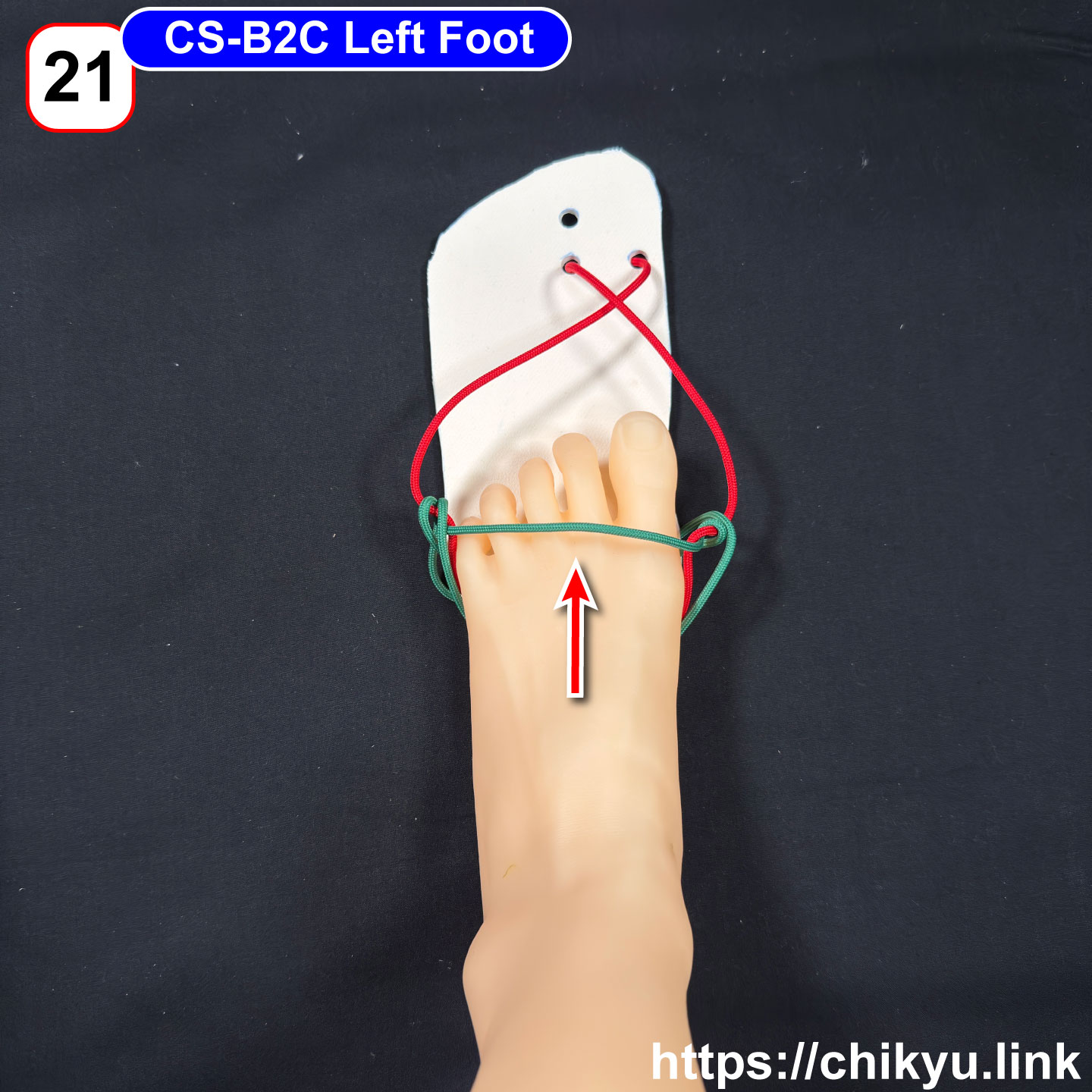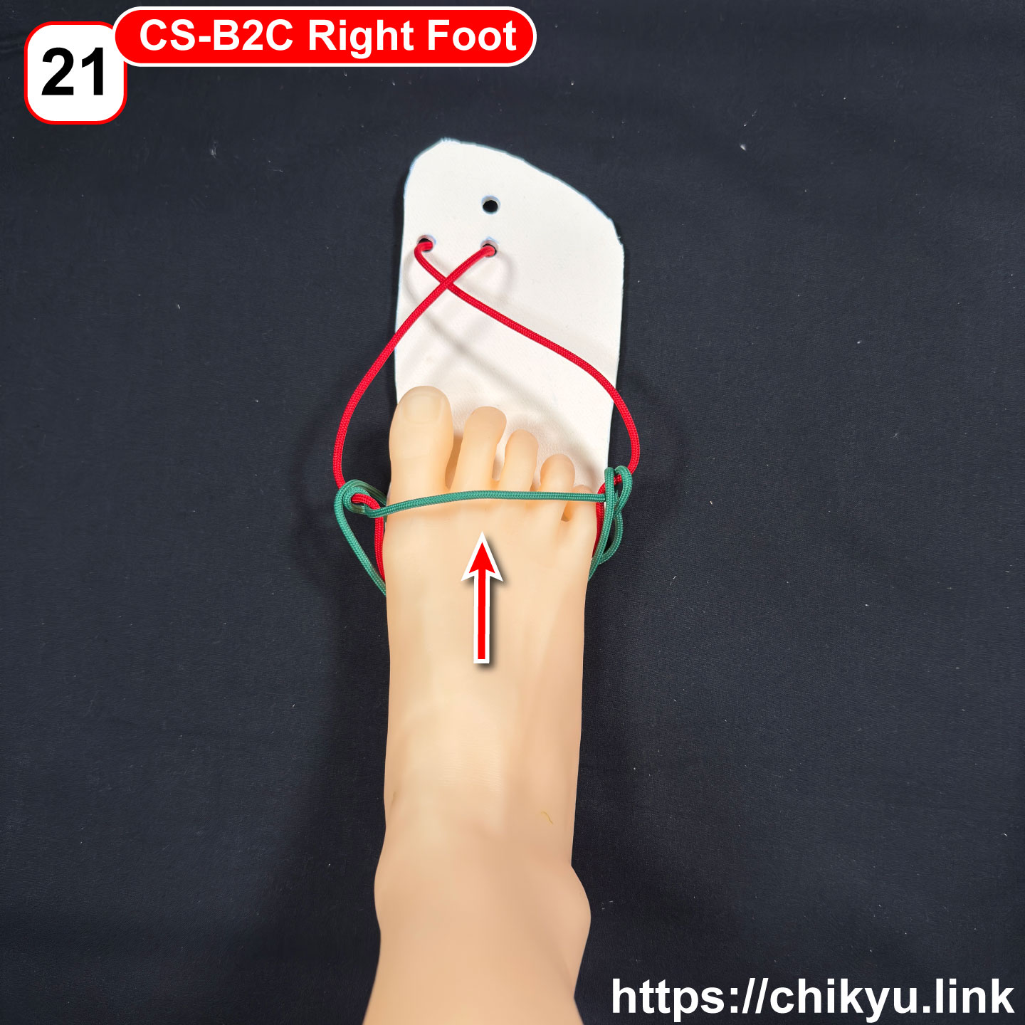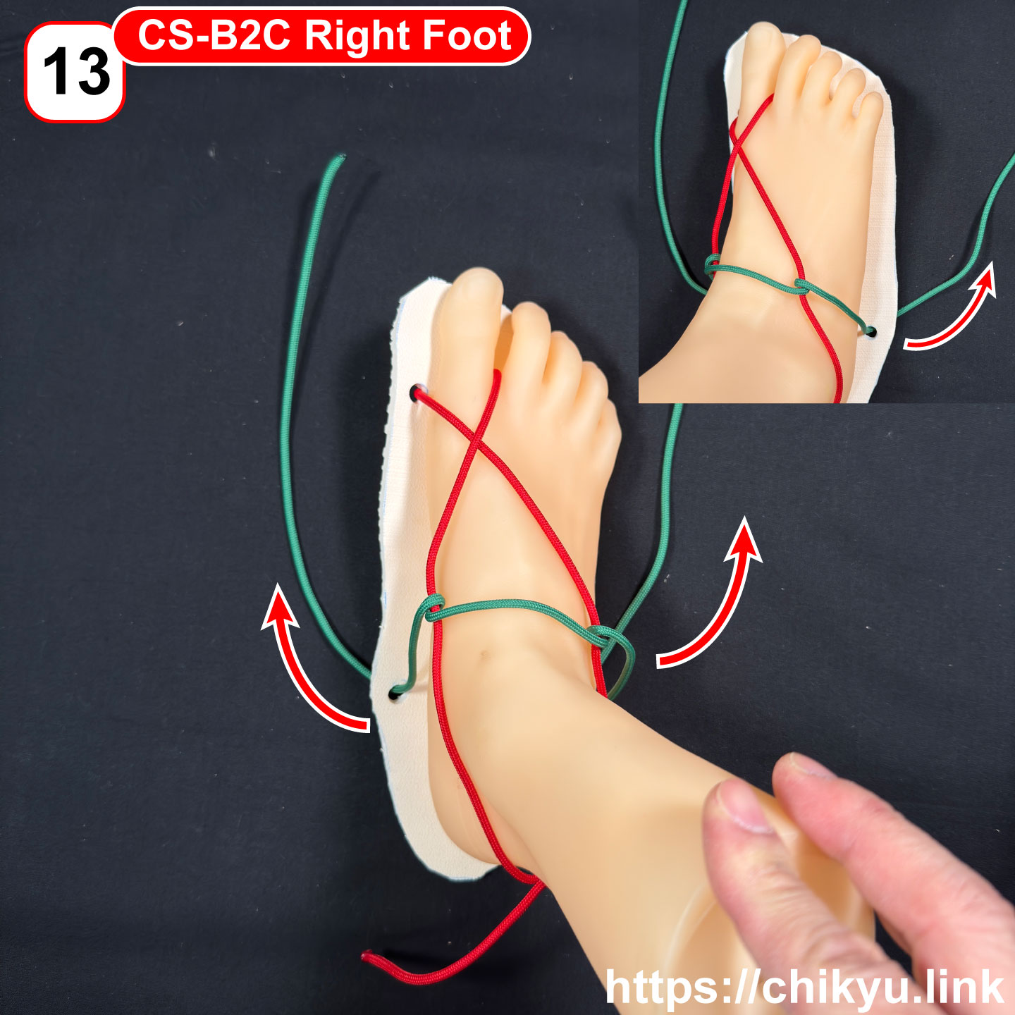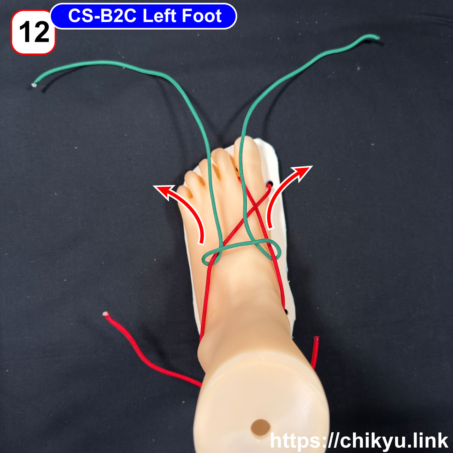 写真のように、後ろ紐(緑)を、前紐(赤)の下に通し、足の踵の方にに持って行きます。