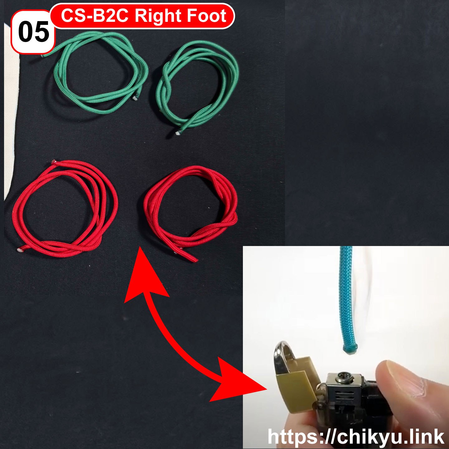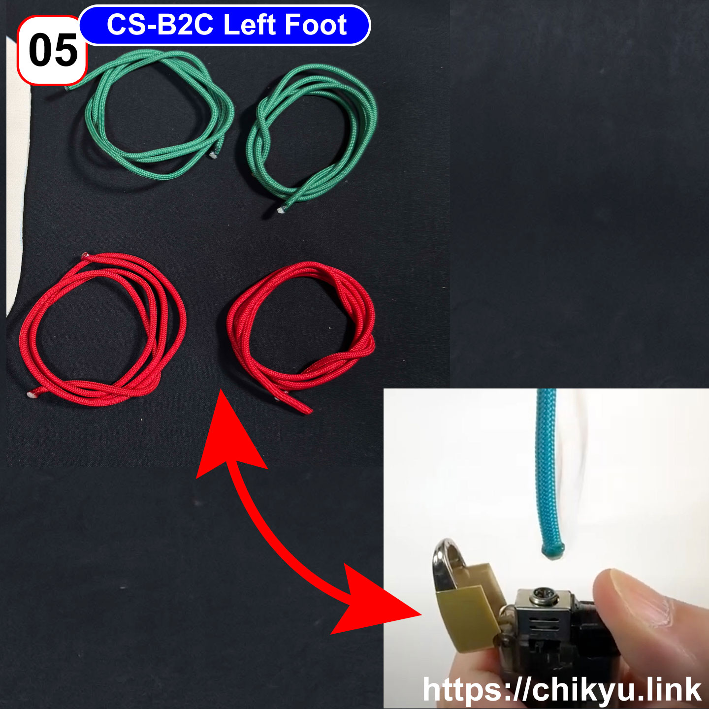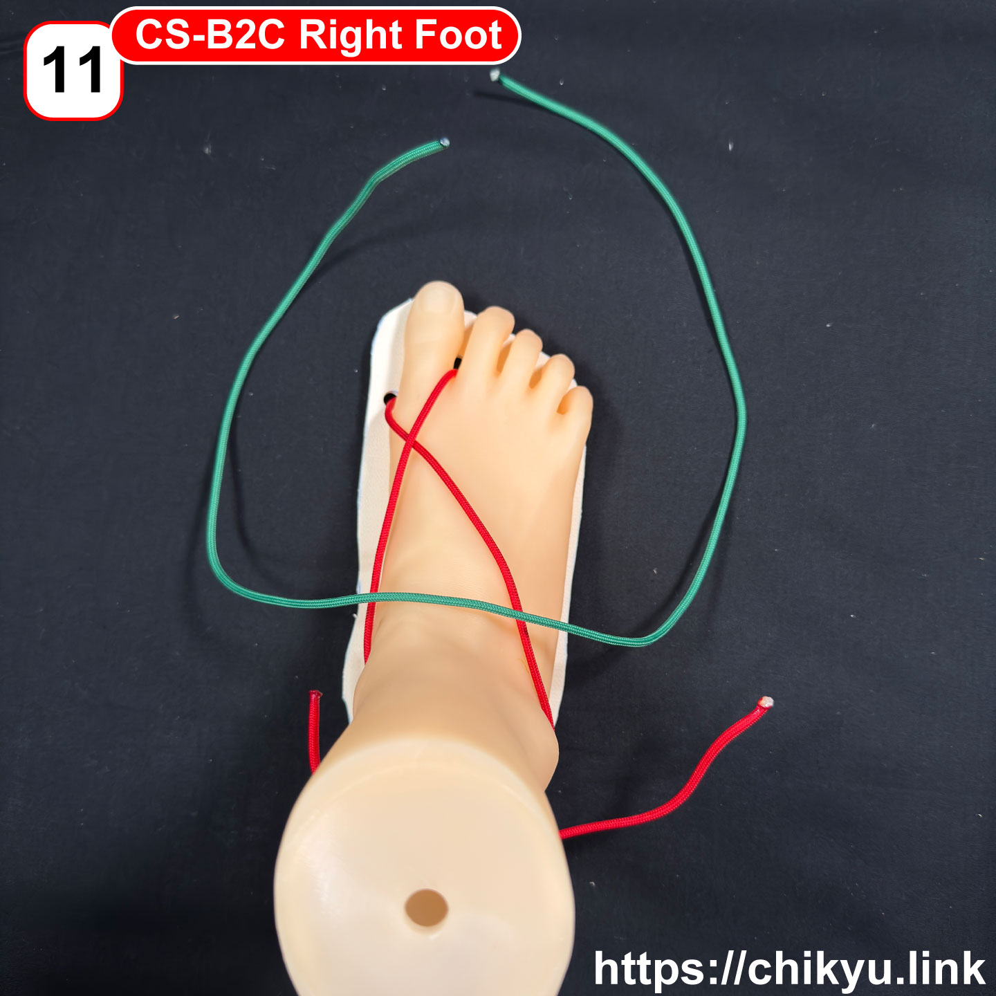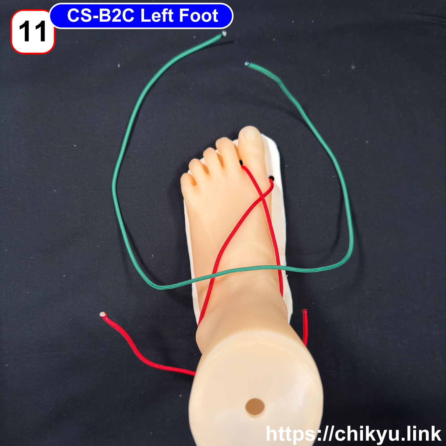 写真のように、後ろ紐(緑)を、前紐(赤)の下に通し、足の踵の方にに持って行きます。