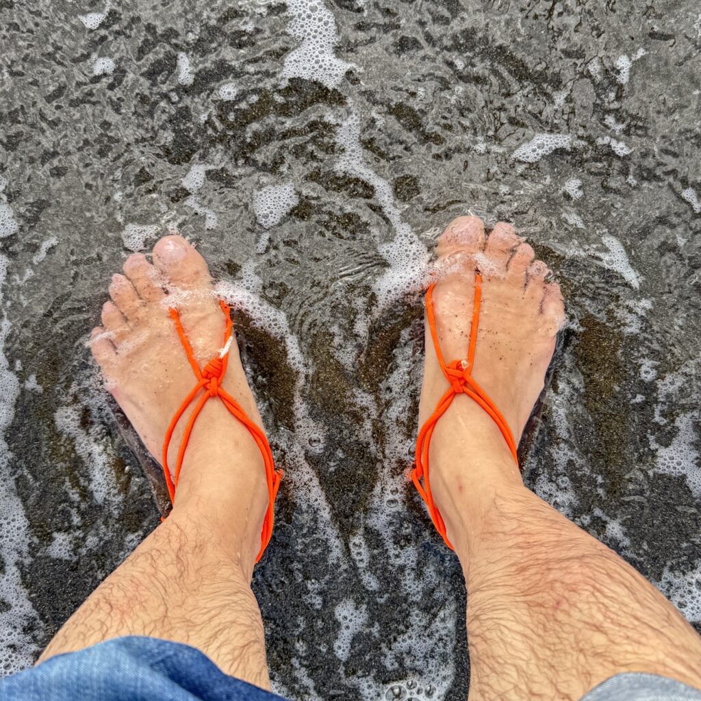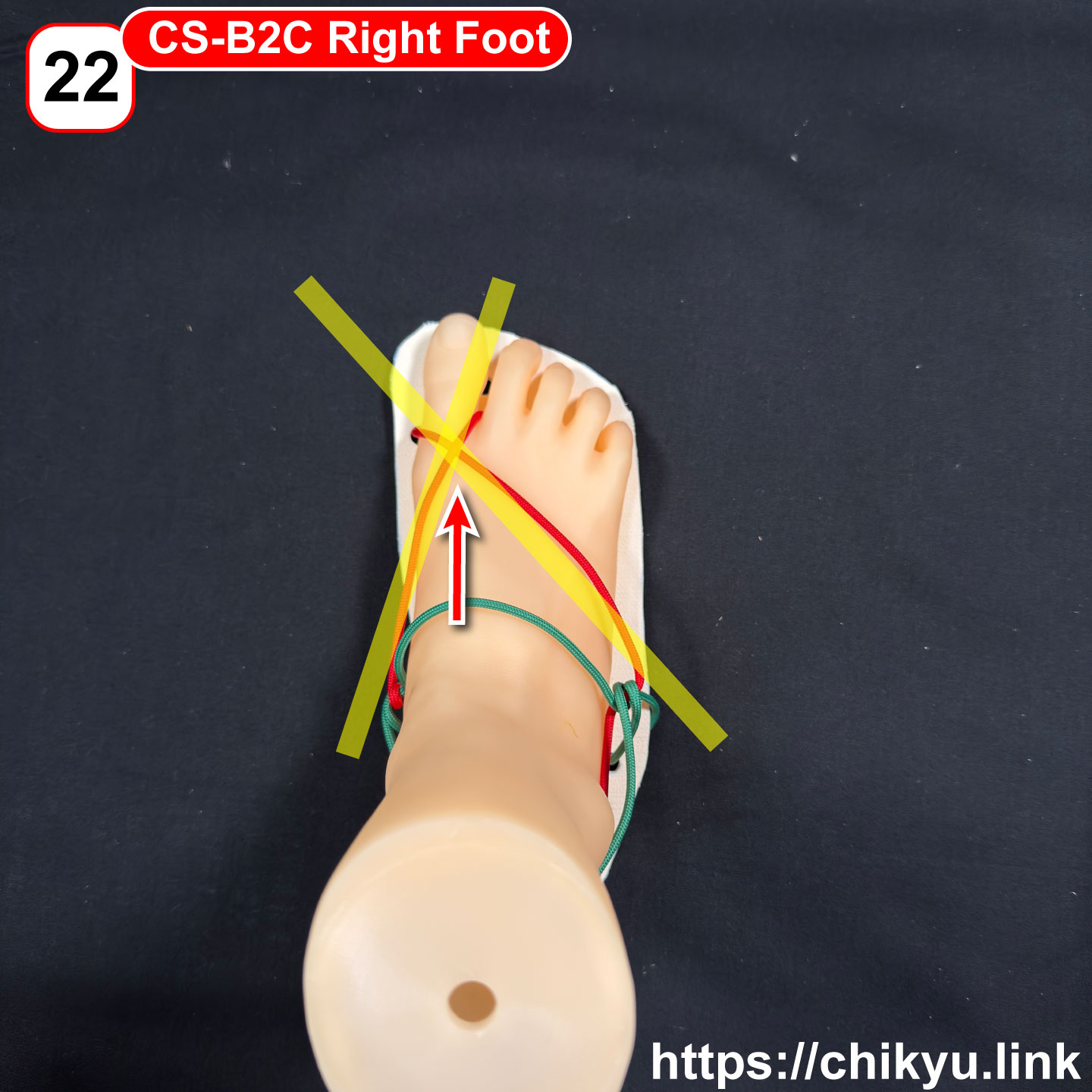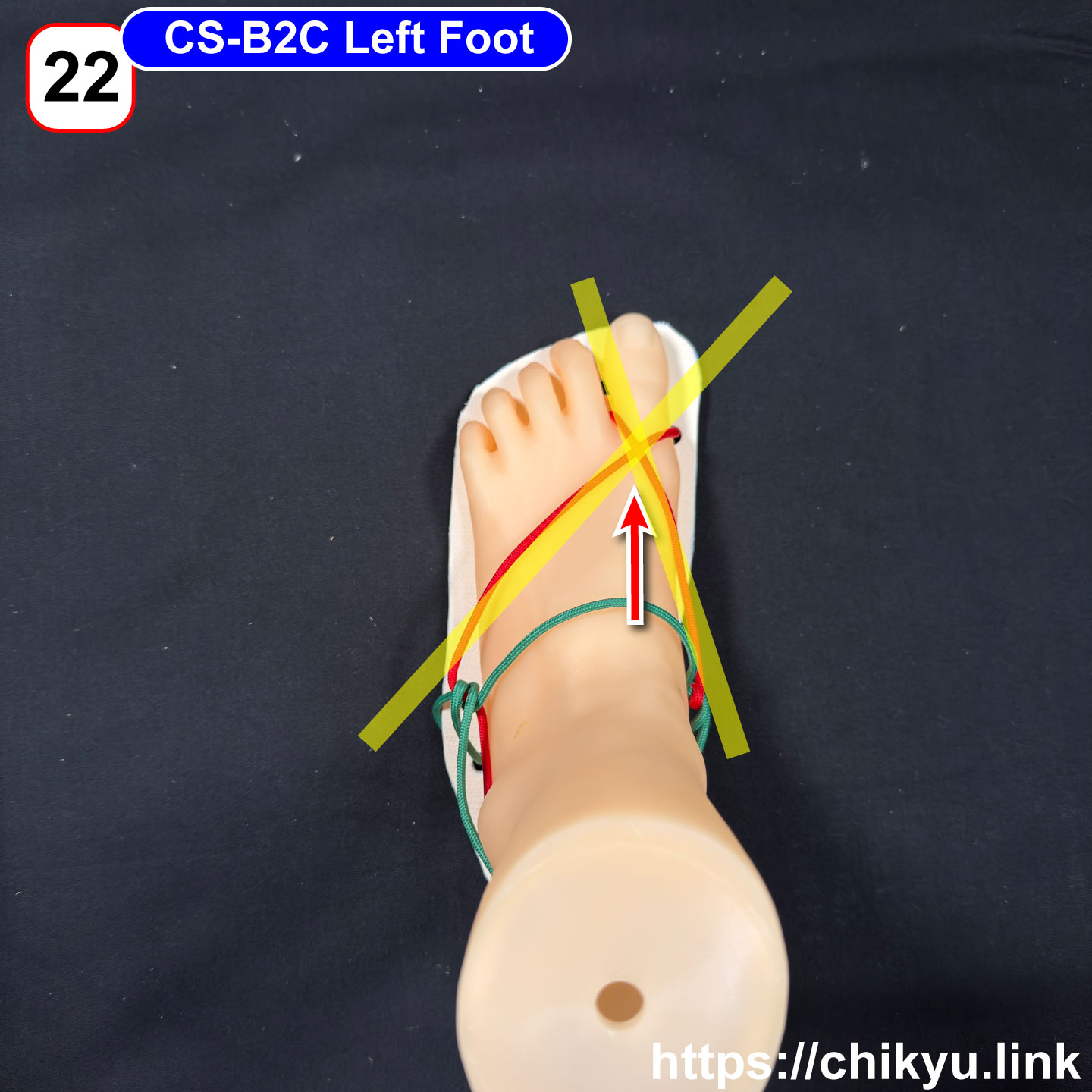 このように、前紐の下に親指をはめることが、ちきゅうサンダルTypeBの特徴の一つです。前紐はX型に、足の甲を支えます。これにより、ゆるい紐の締め具合でも、サンダルを履く時の安定感が増します。他のワラーチと比べ、紐を締めなくても、海や川に入った時のソール(サンダル底)に安定感があります(ぶかぶか感が少ないです)。