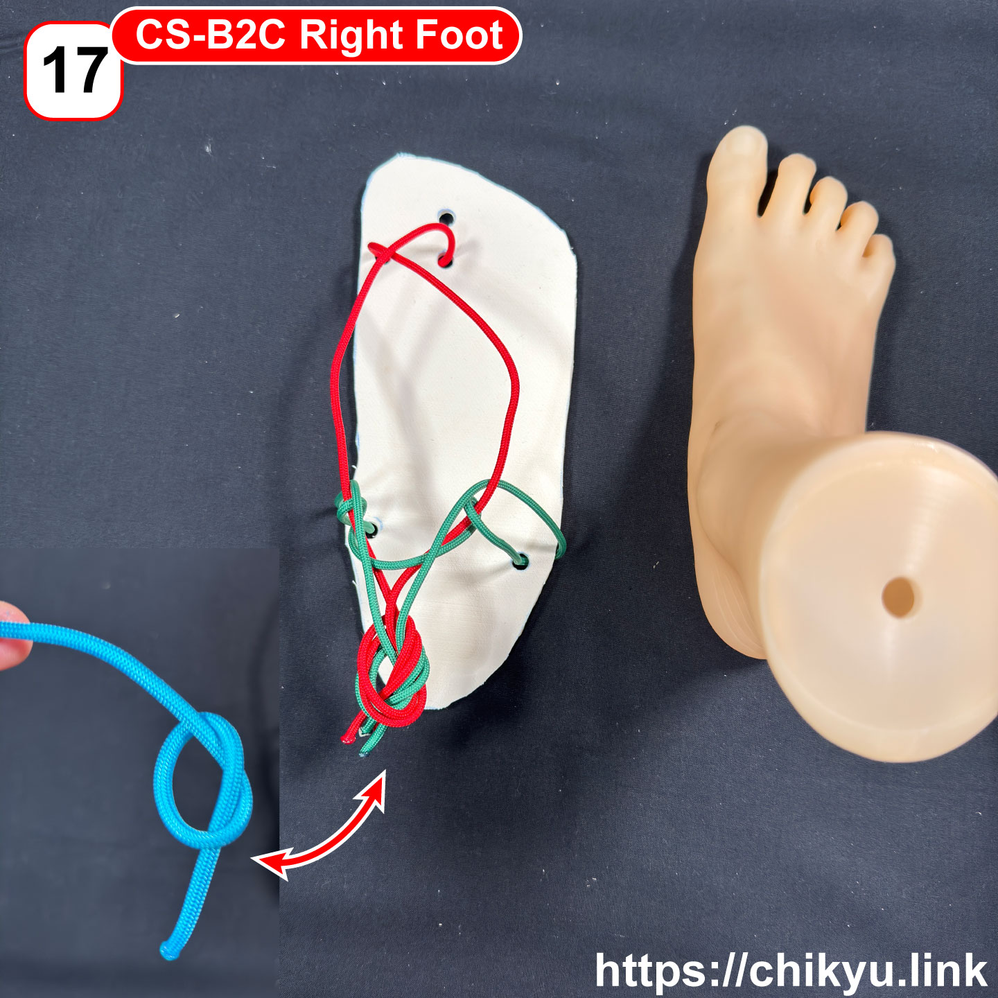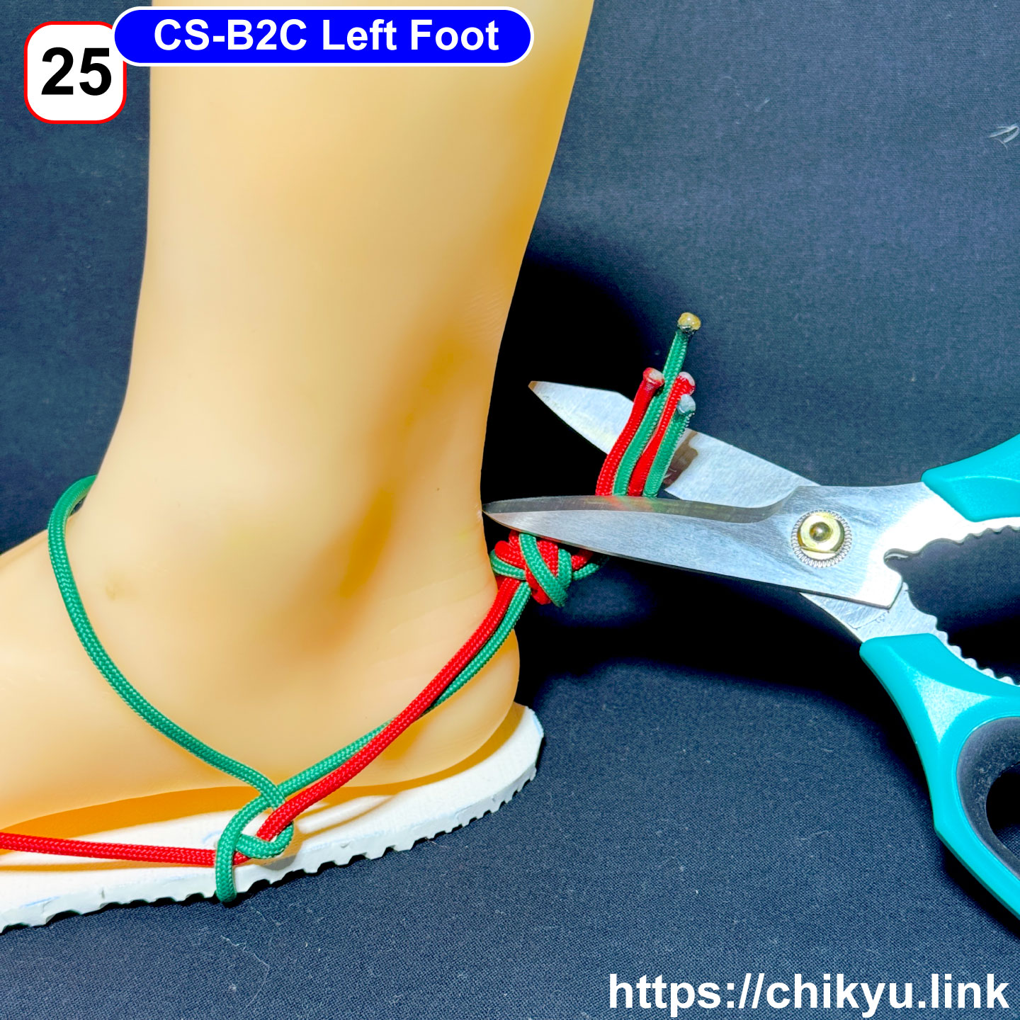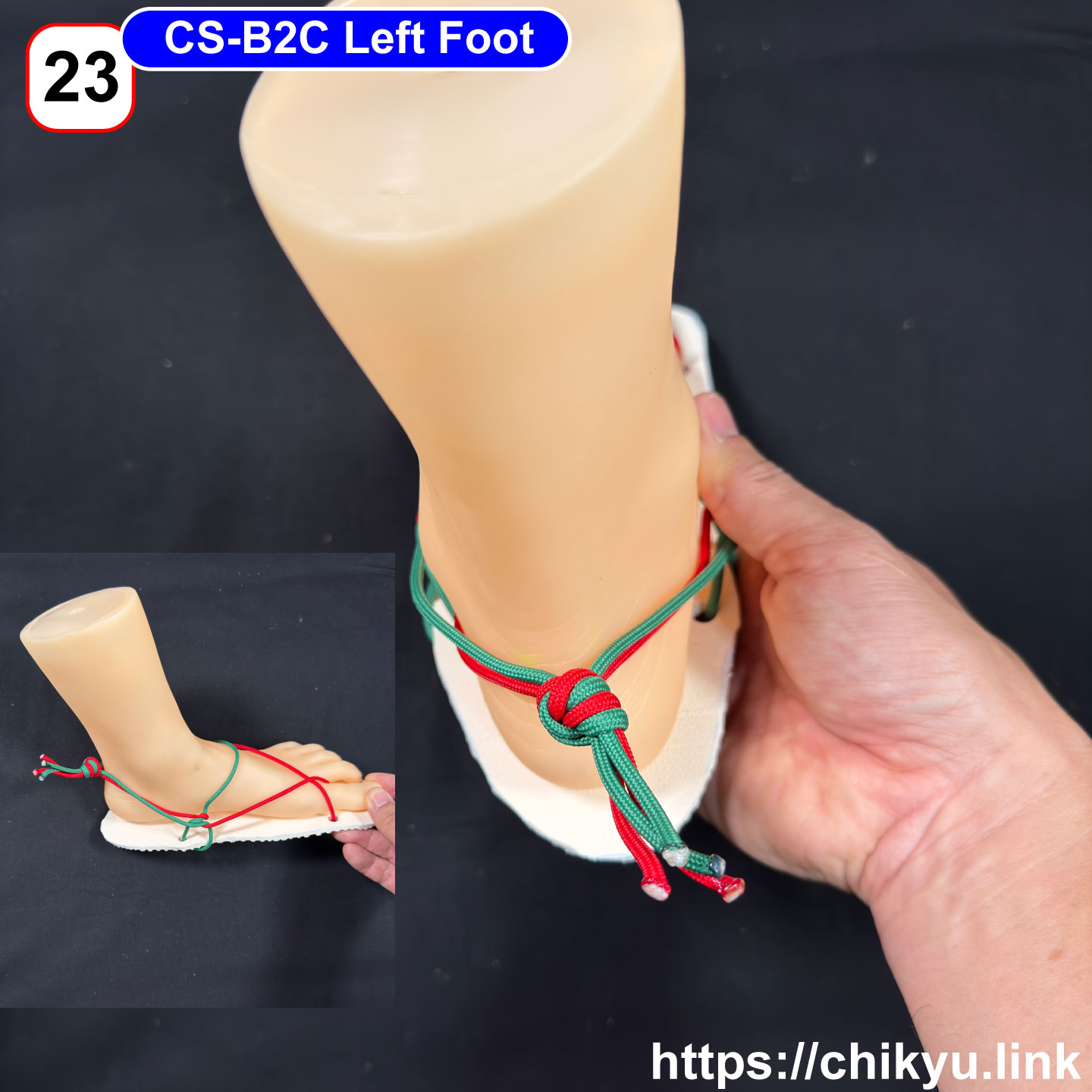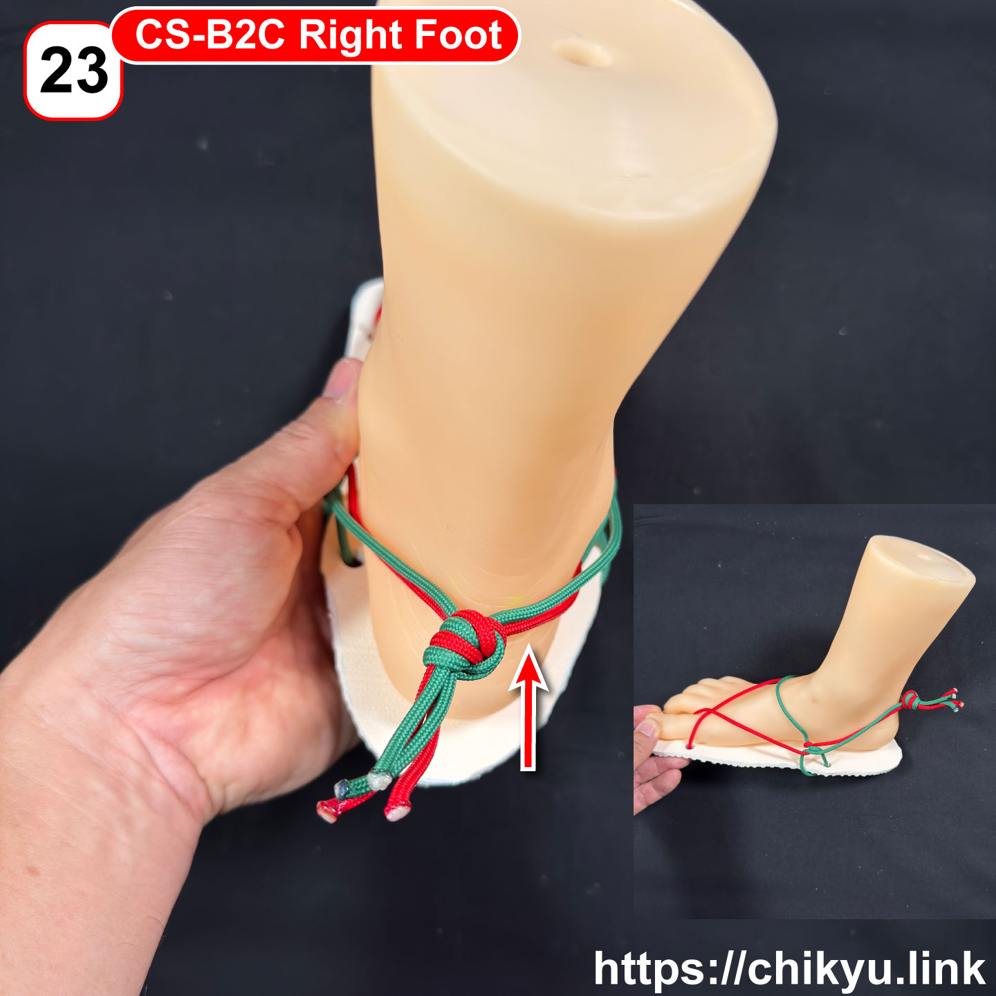 写真のように、前紐(赤)と後ろ紐(緑)を、足の踵でまとめて結びます(一重結び)。この時、一度足からサンダルを脱いだ方が結びやすいです。