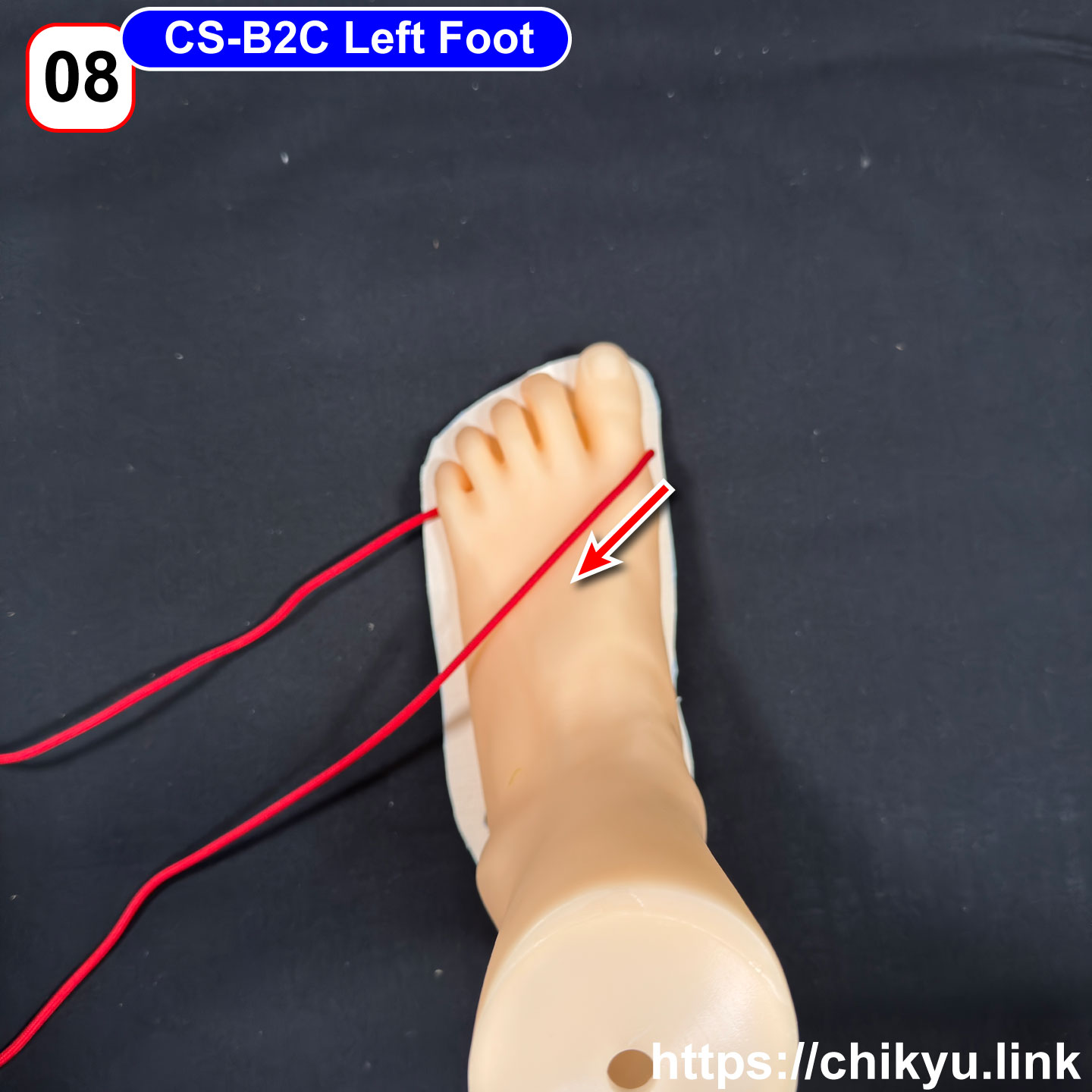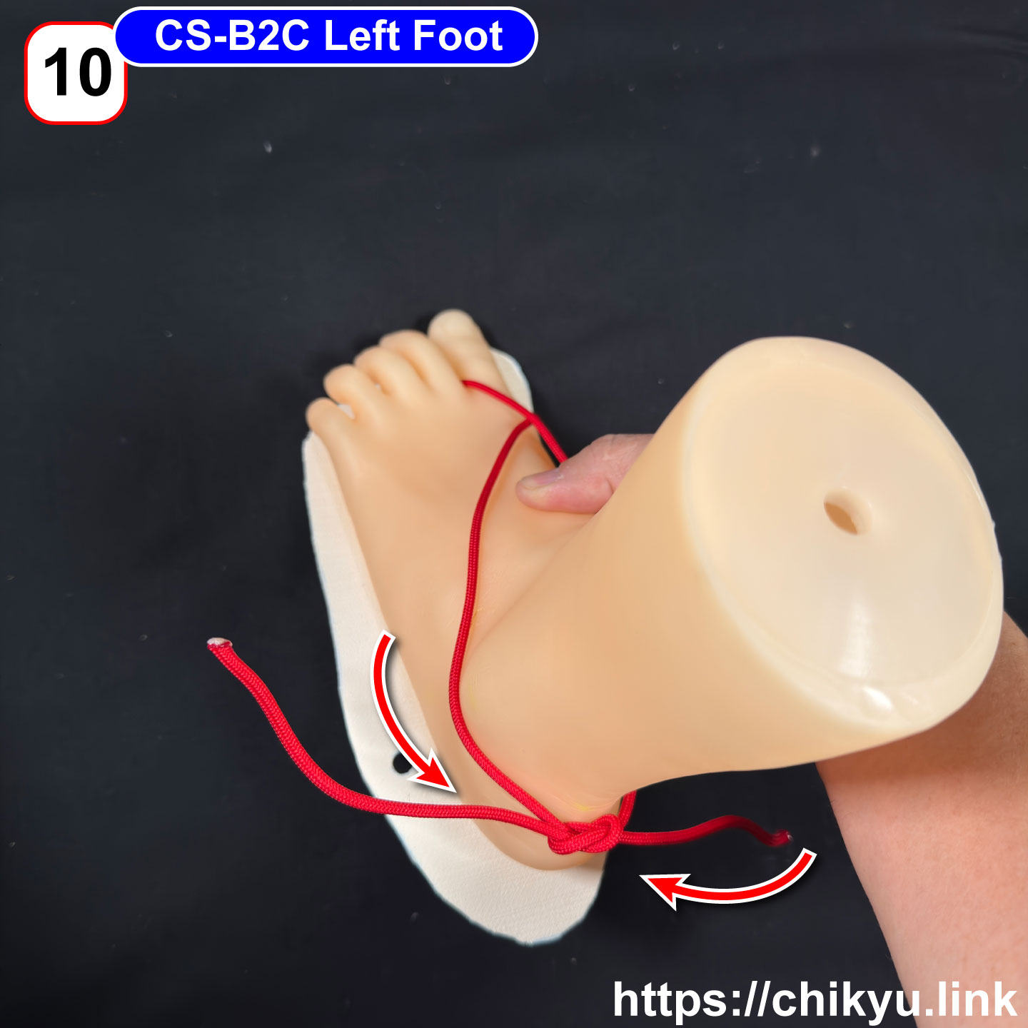 写真のように、前紐の両端を踵の方に回して結びます(これは仮留めです)。