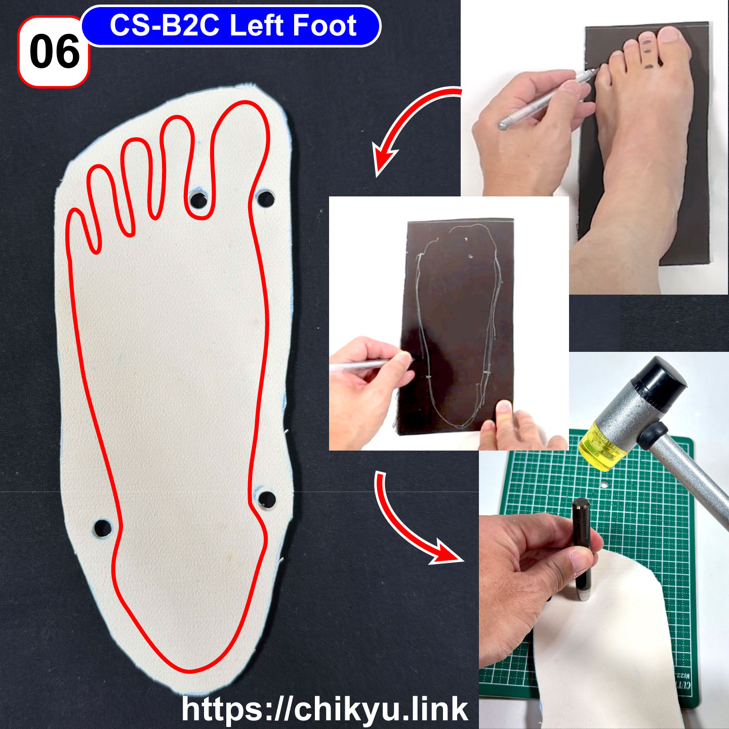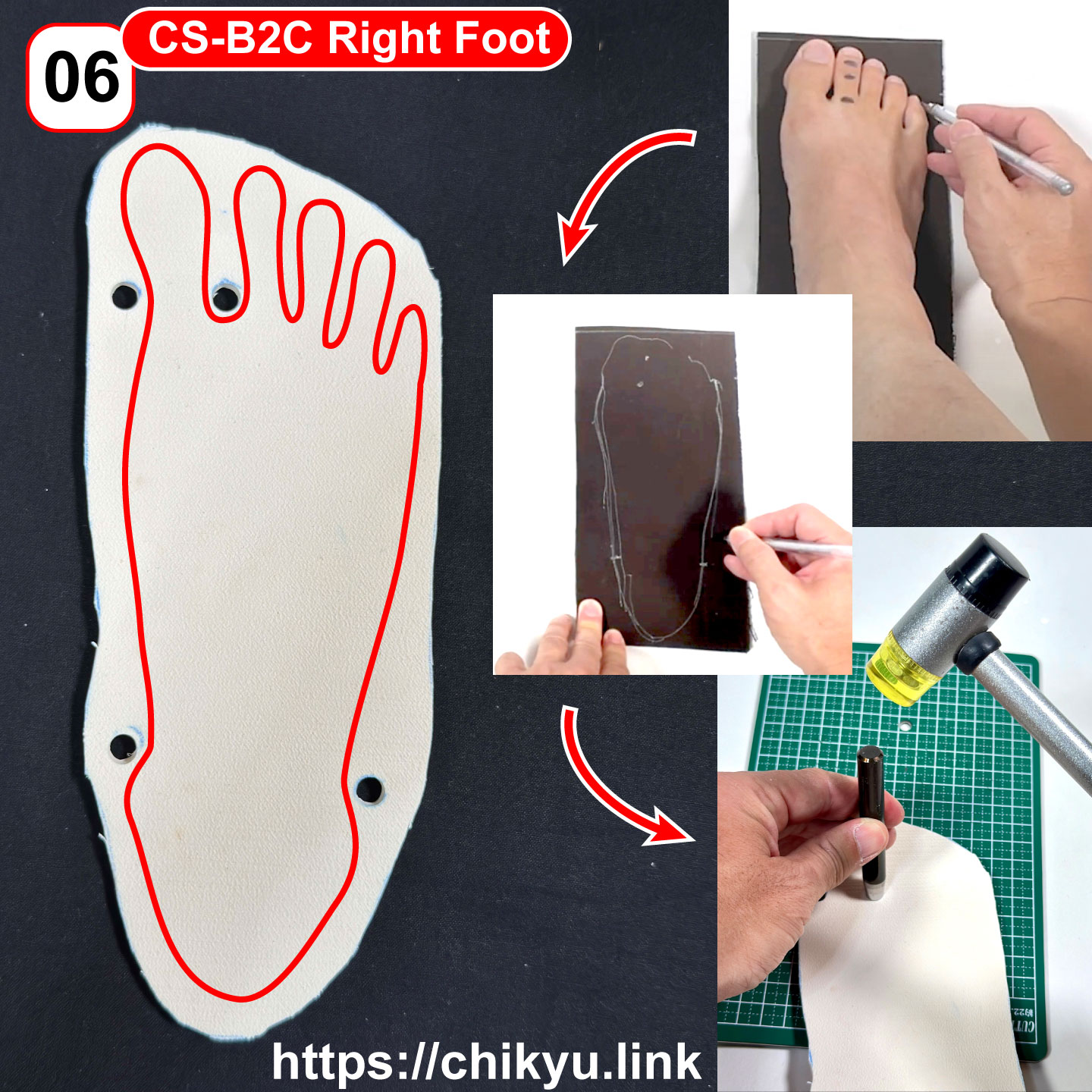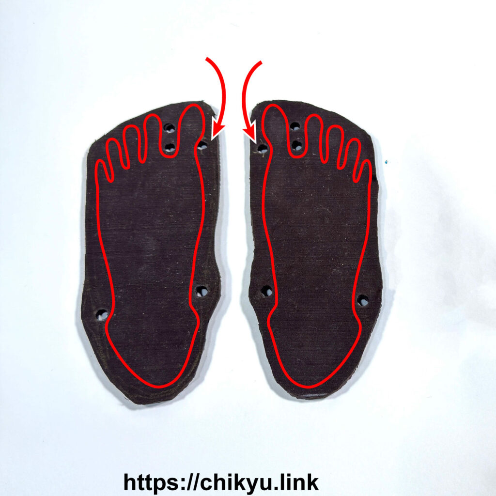 足の形に合わせて、ソール(サンダル底)を描き、切り取ります。下の図のように穴を開けます。