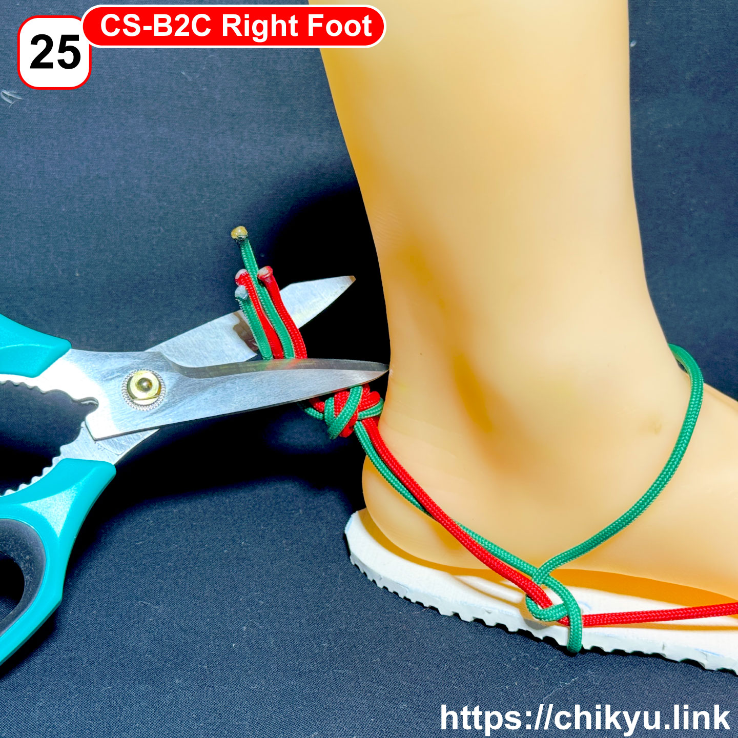 お好みで、足の紐を切りそろえても良いでしょう。コツは、前紐と後ろ紐の長さが同じになるように気をつけることです。そうすると、後で前紐と後ろ紐を交換し、サンダルの色の変更を簡単にできるようになるので楽しいです。