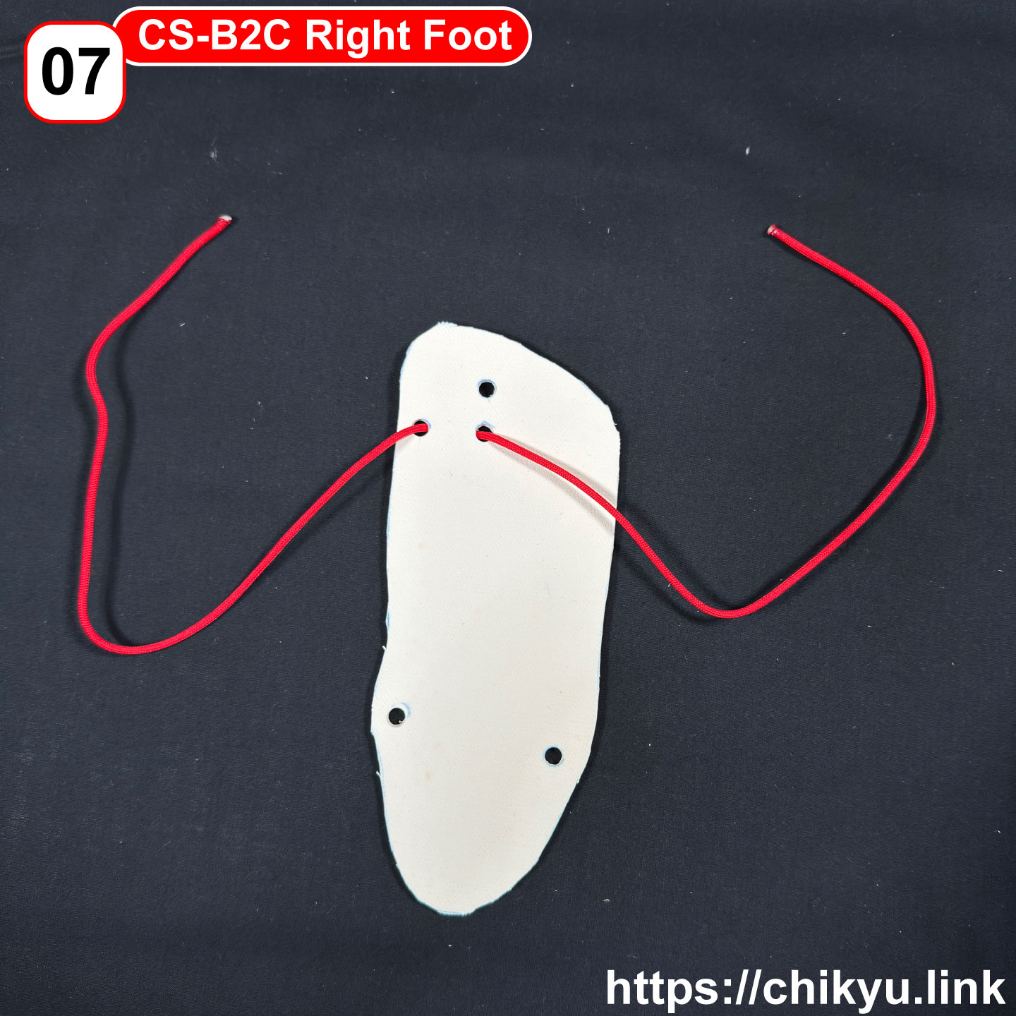写真のように、後ろ紐(緑)を、ソール(サンダル底)のくるぶしに近い左右の穴に通します。