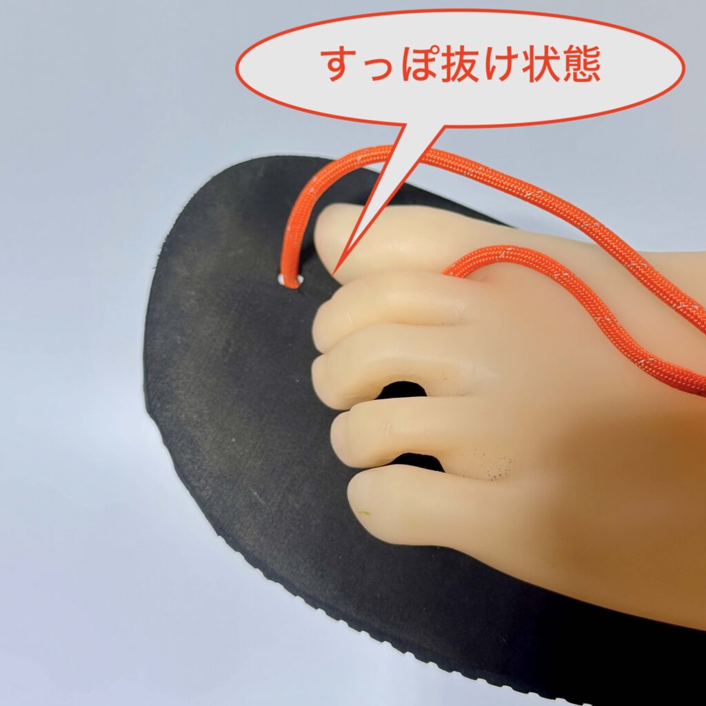この長さの決め方の目的は、下の写真のような、ワラーチ紐が指から外れる「すっぽ抜け/指抜け」状態が起こりづらいようにすることです。
