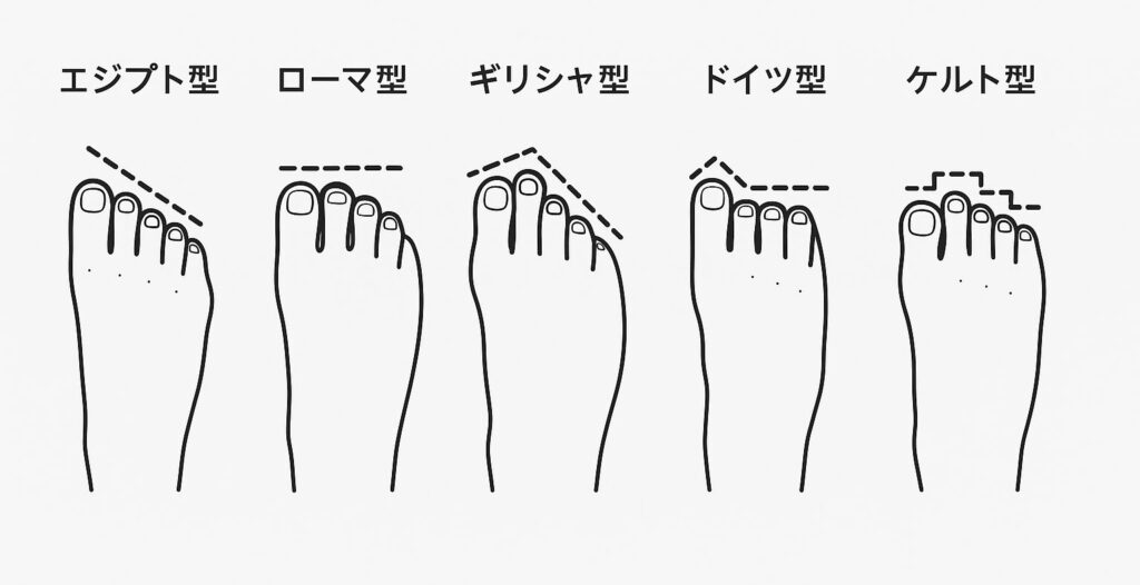 人間の足先の形には、とても多くの種類があります。以下のような分類に加えて、外反母趾・内反小趾のような変形が組み合わさると、顔と同じ様に、足も人の数だけ形があるように感じています。