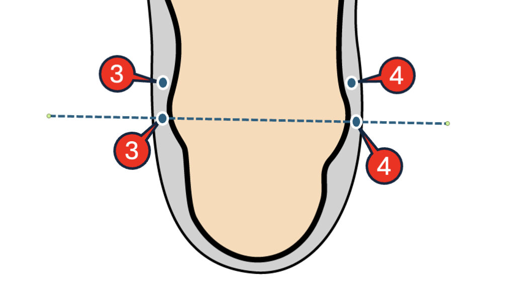 こういった様々な足の形がある中でも、ワラーチとして機能する、わかりやすく作りやすい穴の位置の決め方として、前述の「第一指(親指)と第二指の長さを比べてどちらか短い方の半分の部分」 という考え方で製作しています。
