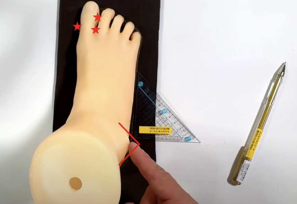 くるぶし部分の穴の位置を決めるために、三角定規を使っています。